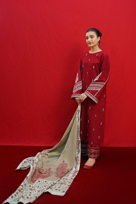 Dhanak Embroidered 3PC with Pashmina Wool Shawl (Unstitched)